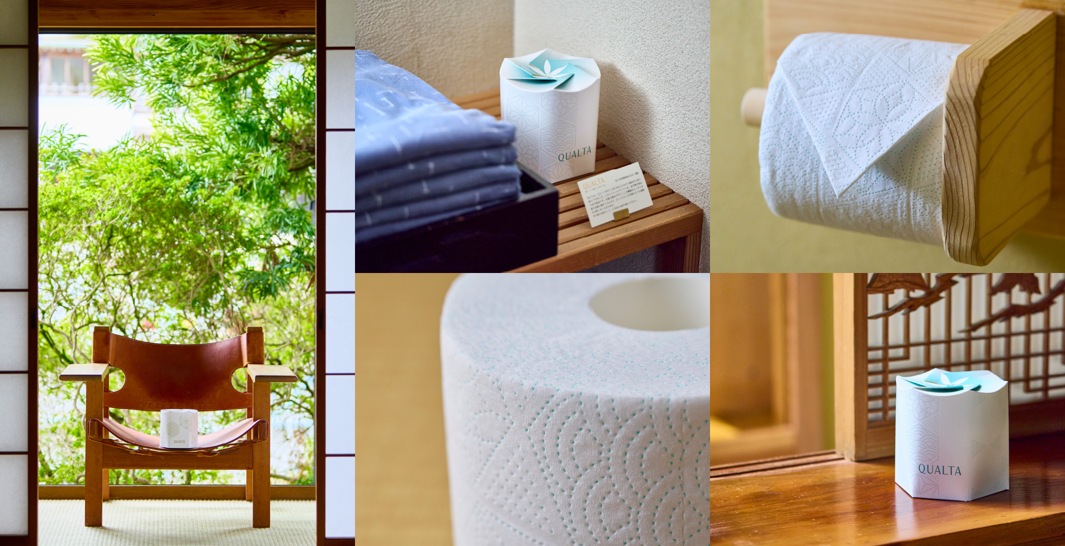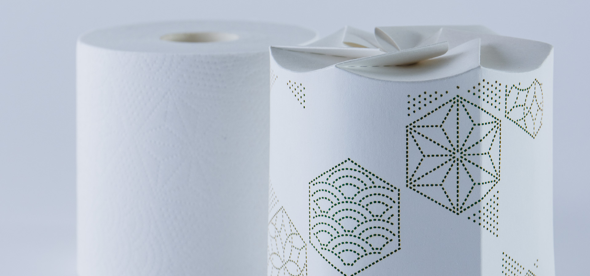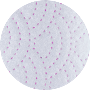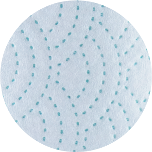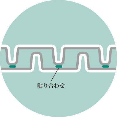 2層×2枚の紙を、お肌に触れる面がバージンパルプ層となるように貼り合わせて、4層構造とします。この時、表裏の型押し模様を入れ子状に配置することにより、立体的な空間が生まれ、ふっくらとした手触りと、高い吸水性をもたらします。