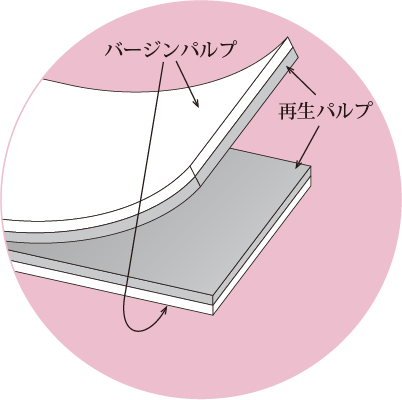 1枚の紙を2種類の原料から形成する当社独自のハイブリッド・ソフト製法を採用しました。表層に柔らかいバージンパルプ、裏層に再生パルプを配置した2層抄きにより、再生パルプを高配合しながら、なめらかな柔らかさを実現した、環境に優しい技術です。